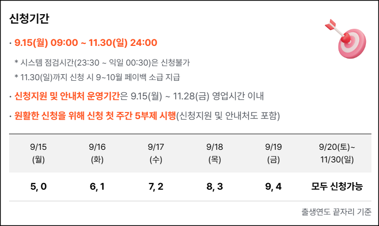 - 상생소비복권 응모 : 9월15일(월) ~ 10월 12일 까지 상생페이백 신청 시 자동 응모