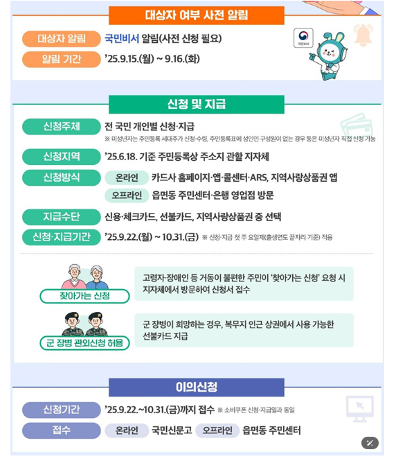 내가 대상자인지 9월 22일 오전 9시부터 직접 조회할 수 있습니다. 또한, '국민비서' 알림 서비스를 신청하면 9월 15일부터 대상 여부를 문자로 미리 안내받을 수 있으니 꼭 활용해 보세요!