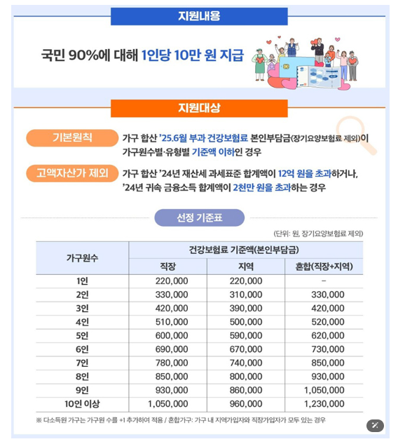 이번 2차 지급은 전국 공통 기준을 따르므로, 수원시민 역시 동일한 기준으로 지급 여부가 결정됩니다. 기준은 2025년 6월 건강보험료이며, '고액자산가'는 우선 제외됩니다.